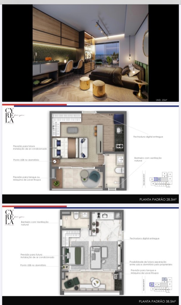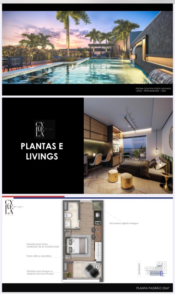 Serão Unidades Studios de 25 Ms até 29 sem Vaga de Garagem Ms,Studios de 36 Ms e 38 Ms Sem Vaga de Garagem e de 46 Ms e 47 Ms com 01 Vaga de Garagem(100% vendidos)