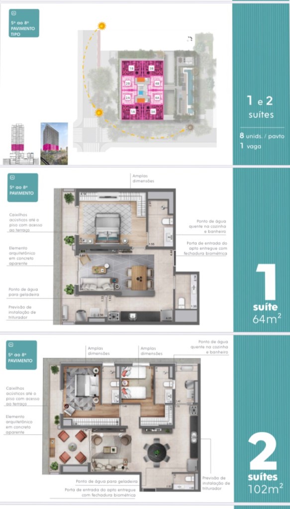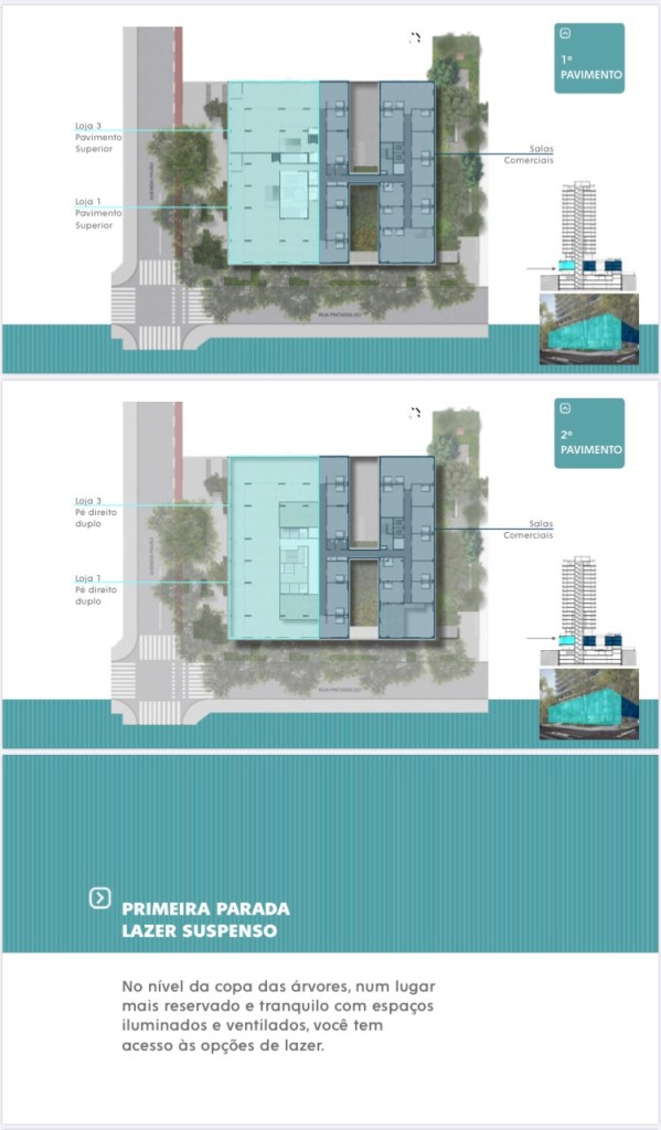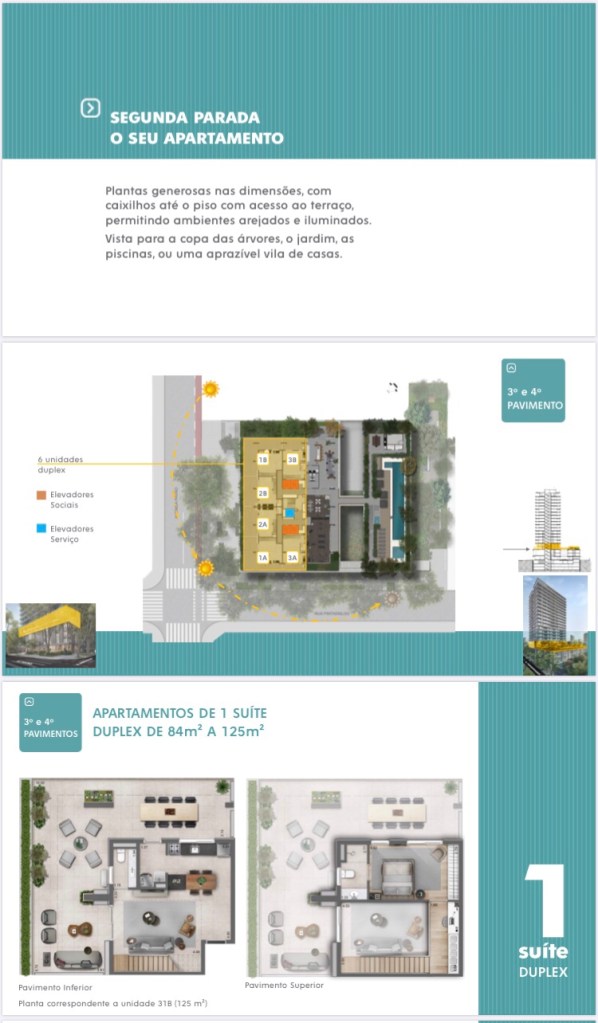 Com 02 Lojas e 31 Salas comerciais nos Primeiros Pavimentos,o Elevo contará com Apartamentos Duplex de 83 Ms até 124 Ms até o 4.Quarto Andar e do 5.Quinto Adar até o 8. Oitavo Andar serão Apartamentos de 64 Ms com 01 Uma Suíte e de 103 Ms com 02 Duas Suítes Todos com 01 Vaga de Garagem inclusive os Duplex