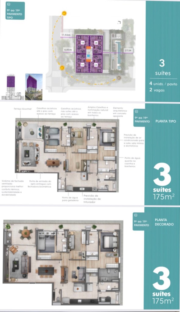 No 9. Nono Andar até o 19.Decimo Nono Andar serão Apartamentos de 175 Ms com 03 Três Suítes e 02 Duas Vagas de Garagem