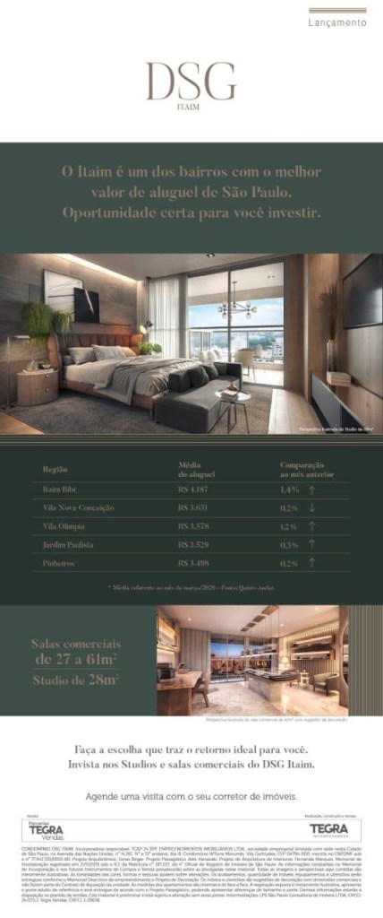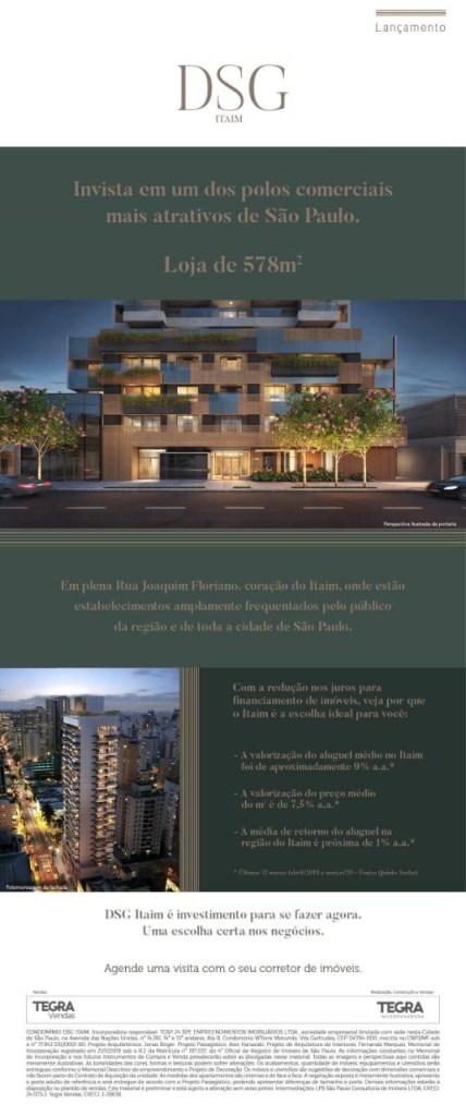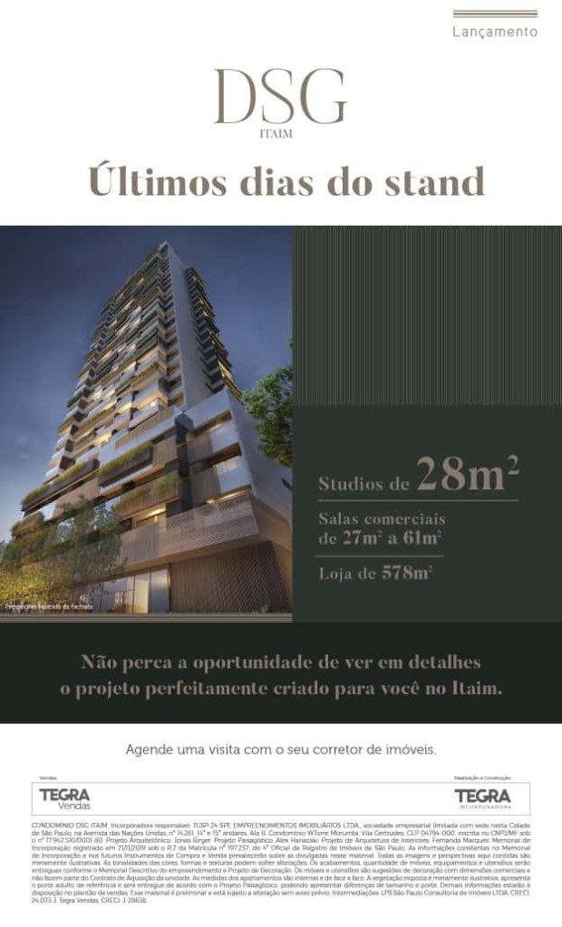Está chegando o Edifício que você esperava no Itaim,a Tegra convida vocês a conhecerem o DSG Itaim,em uma Localização maravilhosa,na Rua Joaquim Floriano 146,proximo as Avenidas Santo Amaro e São Gabriel e Juscelino e Brigadeiro,o DSG vem com Facil acesso a toda a Cidade e na medida para acolher o público desse Bairro que Encantador.