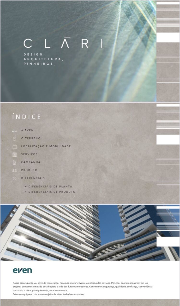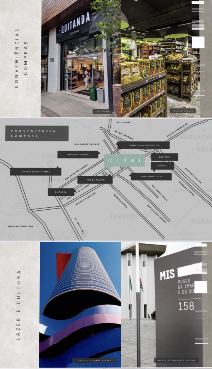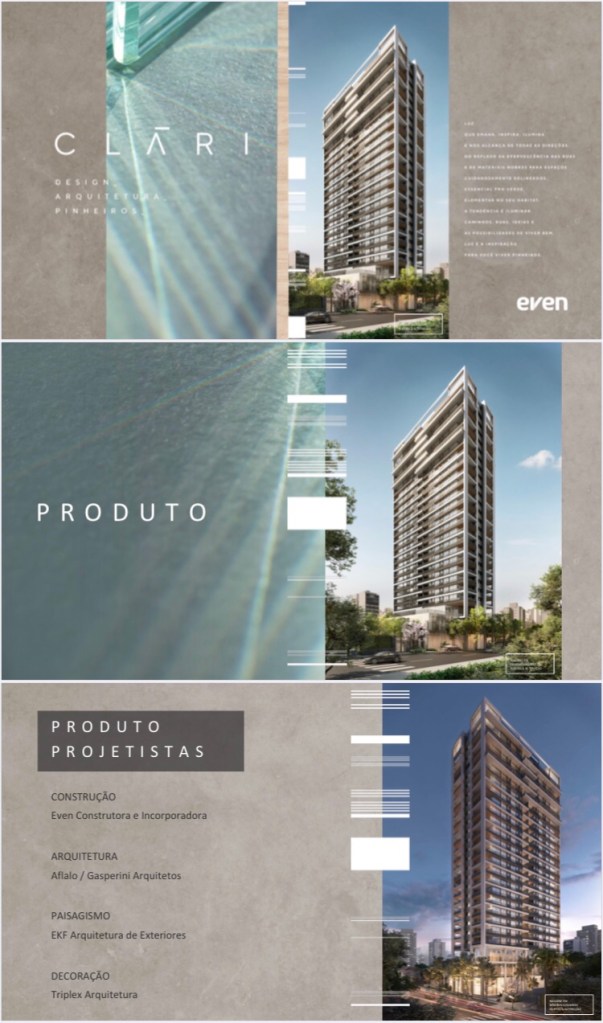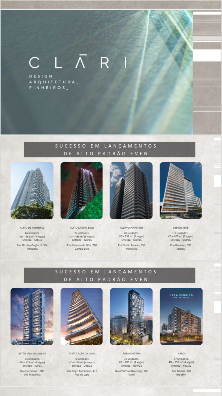 A Even convida a Vocês a Conhecerem o Clari Pinheiros,o mais novo Empreendimento de Alto Padrão da Even em Pinheiros,entre o Jardins e Pinheiros,nas Ruas João Moura e Arthur de Azevedo,uma Quadra com uma Localização Fantástica e Com os melhores Restaurantes e Comércios ao Lado,próximo a Av.Paulista e Oscar Freire e a 3 Quadras do HC Clínicas e com um Corredor da Av.Rebouças com Acesso a Toda a Cidade
