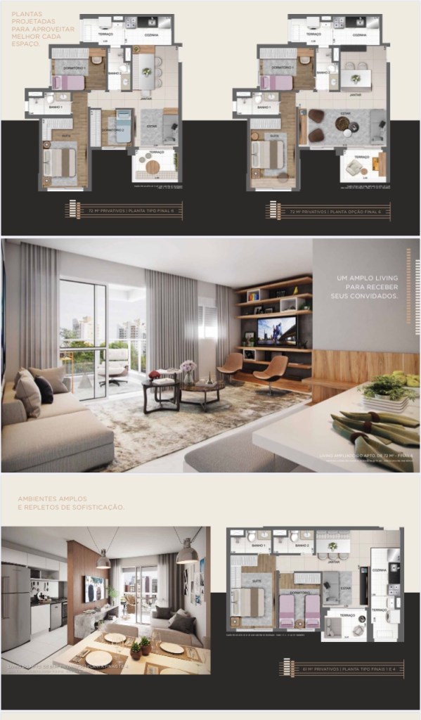 Serão Apartamentos de 61 Ms de 02 Dois Dormitórios e 01 Uma Suíte ou de 01 Uma Suíte e 01 Uma Vaga de Garagem,e de 72 Ms de 03 Três Dormitórios e 01 Uma Suíte ou de 02 Duas Suítes e 01 Uma Vaga de Garagem