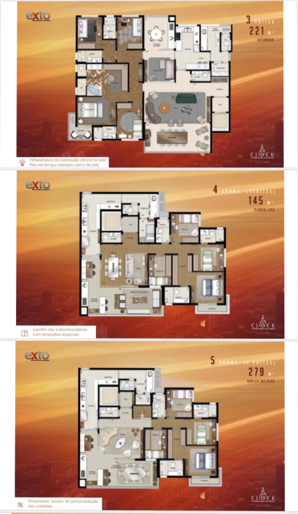 São Apartamentos de 145 Ms de 04 Quatro Dormitórios e 03 Três Suítes e 03 Três Vagas de Garagem ,de 175 Ms de 04 Quatro Suítes de 03 Três ou 04 Quatro Vagas de Garagem de 221 Ms de 03 Três Suítes e 04 Vagas de Garagem e Coberturas Duplex de 279 Ms de 05 Cinco Dormitórios e 04 Quatro Suítes e 05 Cinco Vagas de Garagem e de 337 Ms Duplex de 05 Cinco Suítes e 05 Cinco Vagas de Garagem sendo que Todas as Unidades Possuem um Box na Garagem !!!!