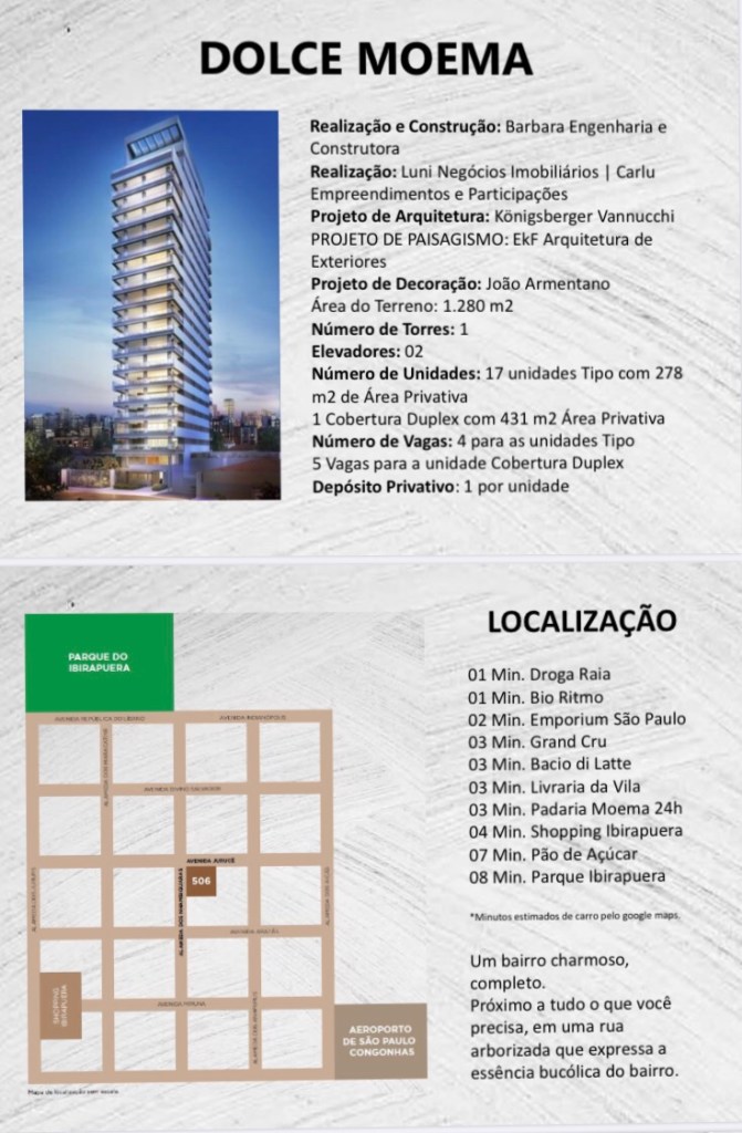 Localizado na Av.Jurucê 506 Moema Índios,o Dolce está Implantado em um Terreno de 1.280 Metros e terá a Arquitetura de Konigsberg Vanucchi e o Paisagismo de EKF Arquitetura de Exteriores e a Decoração de Interiores de João Armentano,em um Maravilhoso Projeto de Alto Padrão !!!!