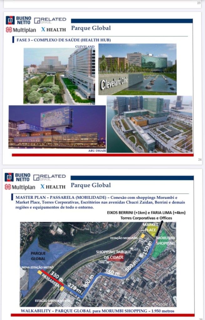 As ContraPartidas que a Bueno Netto cederá para a Iniciativa Publica será uma Passarela de 330 Metros que Ligará o Shopping do Parque Global até Estação de Trem CPTM Granja Julieta no Outro Lado da Marginal Pinheiros e Uma Ciclovia de 1.600 metros que ligará essa Estação até a Estação Morumbi,onde será feito a Conexão com a a Linha Ouro do Metrô!!!!