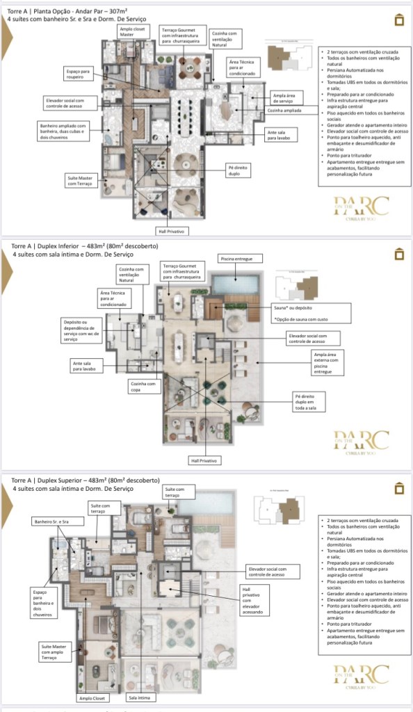 Na Torre A teremos Apartamentos de 307 Ms e 308 Ms de 04 Quatro Suítes e 04 Vagas de Garagem e 02 Duas Coberturas Duplex de 483 Ms de 04 Quatro Suítes e 04 Quatro Vagas de Garagem e Apartamentos Giardinos