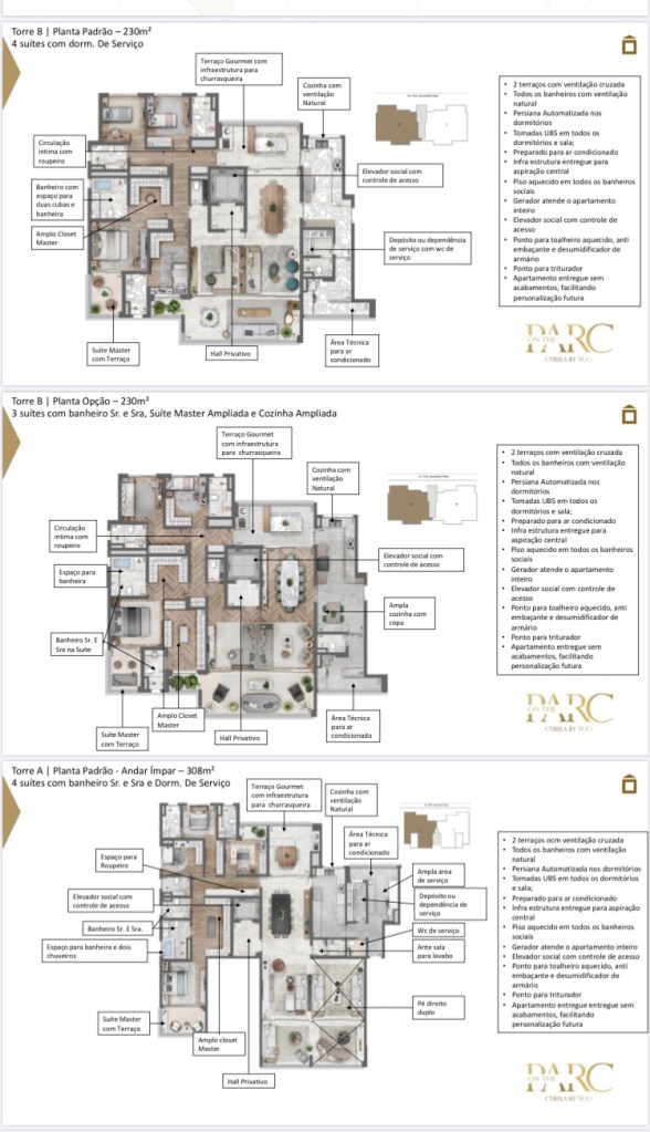 Na Torre B teremos Apartamentos de 230 Ms de 03 Três ou 04 Quatro Suítes e 03 Três Vagas de Garagem e 02 Duas Coberturas Duplex de 411 Ms de 04 Quatro Suítes e 04 Quatro Vagas de Garagem e Apartamentos Giardinos