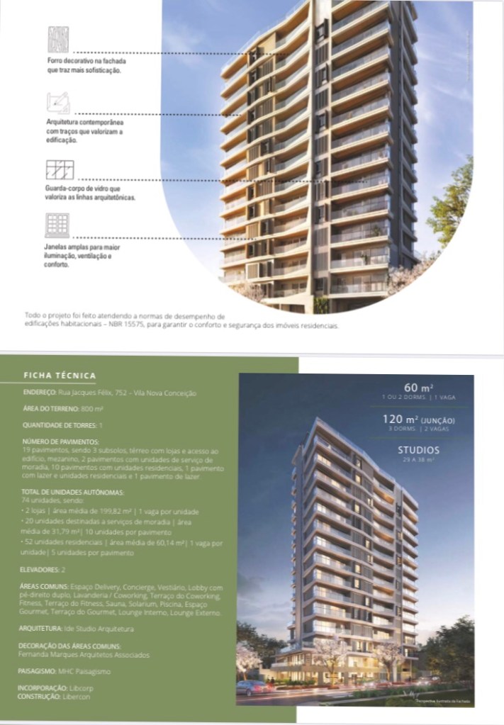 Localizado na Rua Jacques Félix 752 Vila Nova Conceição,o Empreendimento terá 02 Duas Lojas de 200 metros na Entrada e serão Apartamentos Com Serviços Não Residenciais de 29 Ms a 39 Ms,Studios e de 01 Um Dormitório e de 60 Ms de 01 Uma Suite ou de 02 Dois Dormitórios e 01 Uma Suíte e 01 Uma Vaga de Garagem!!!
