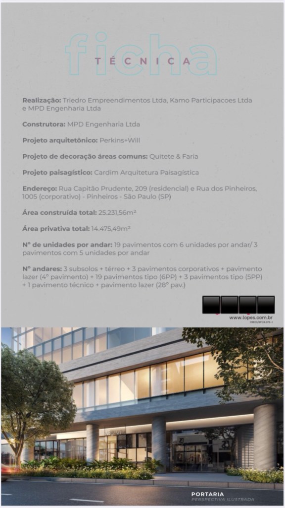A Entrada da Torre Residencial será pela Rua Capitão Prudente 209-Pinheiros e a do Corporativo será pela Rua dos Pinheiros 1005 em Pinheiros!!!