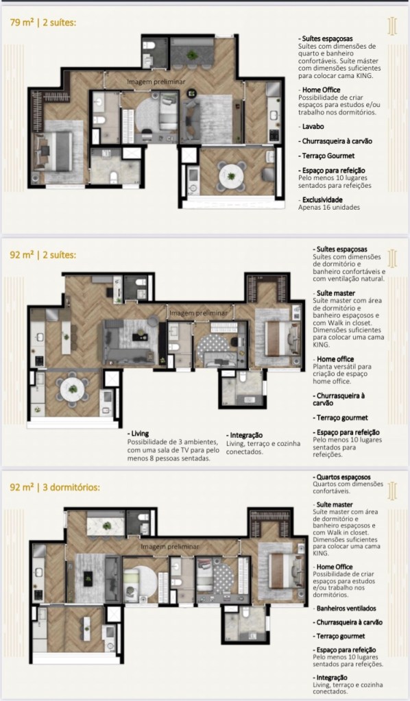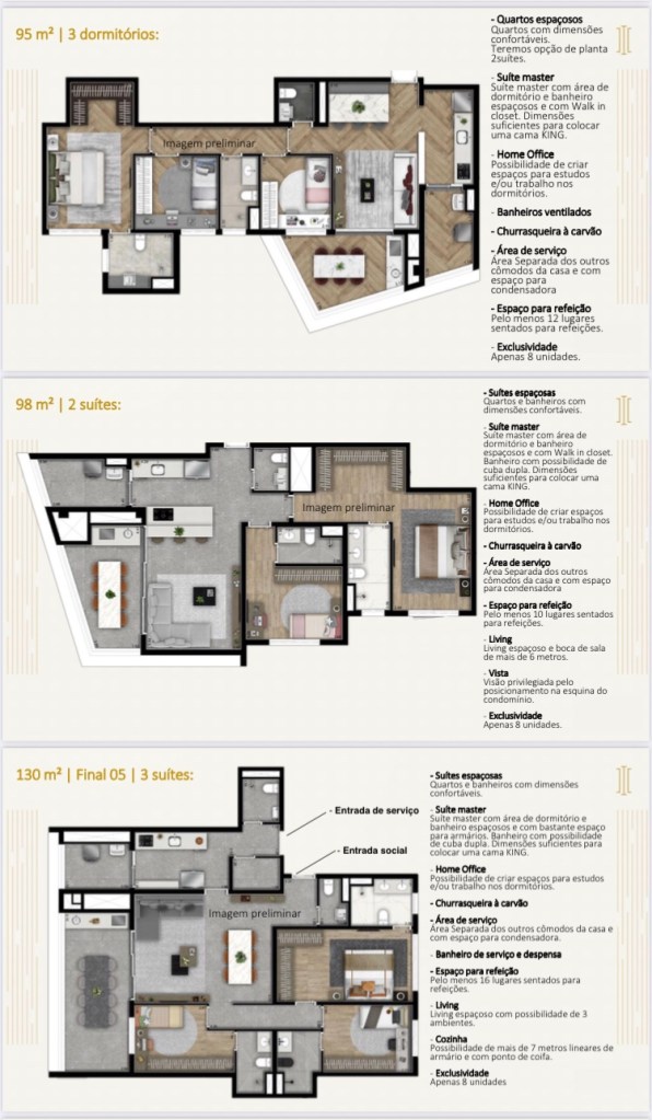 Serão Apartamentos de 79 Ms de 02 Duas Suítes e Lavabo e 01 Vaga de Garagem Determinada,de 92 Ms,95 Ms e 98 Ms de 02 Duas Suítes ou de 03 Três Dormitórios e 01 Uma Suíte e 02 Duas Vagas de Garagem e de 130 Ms com 03 Três Suítes e 02 Duas Vagas de Garagem!!!!