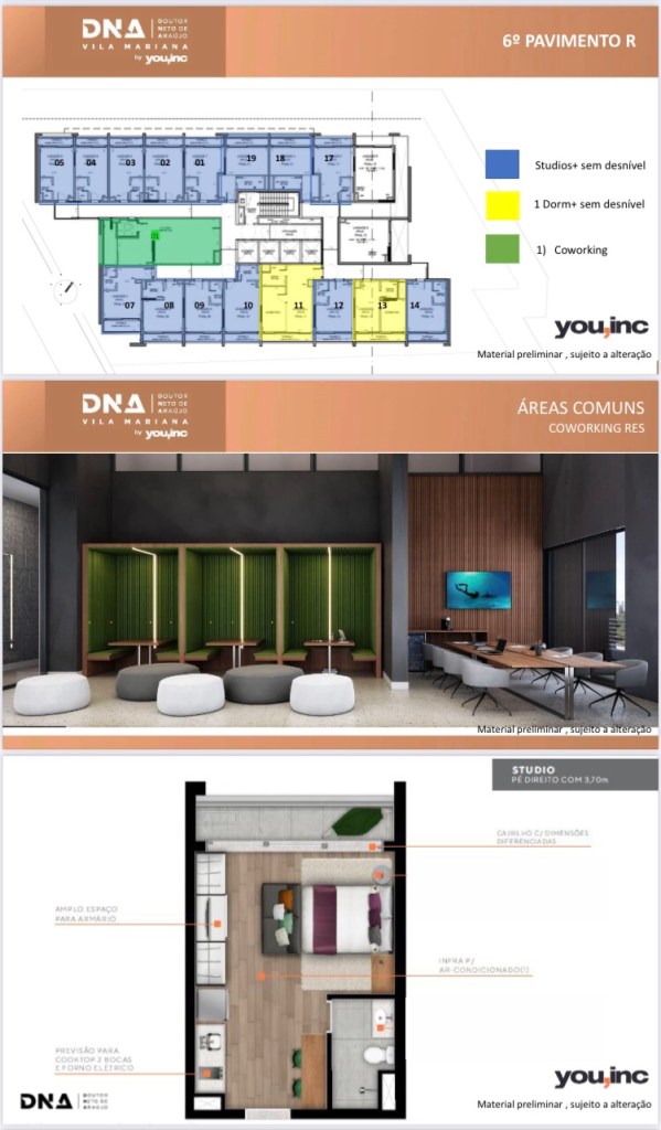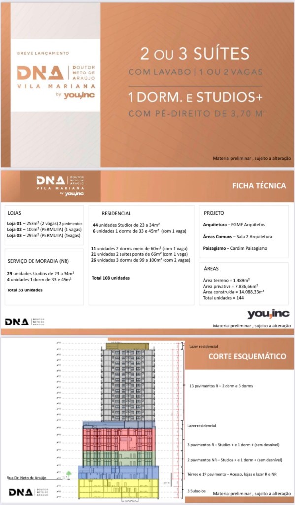 O Edifício estará Localizado na Rua Doutor Neto de Araújo 257 Vila Mariana e serão Studios Não Residenciais com Serviços de Moradia de 23 Ms a 34 Ms com pé direito Alto de 3,70 Ms e de 01 Um Dormitório de 33 Ms e 45 Ms com pé direito alto de 3,70 Ms,Unidades Residenciais Studios de 23 Ms a 34 Ms com pé direito Alto de 3,70 Ms ,de 01 Um Dormitório de 33 Ms e 45 Ms com pé direito Alto de 3,60 Ms com 01 Uma Vaga de Garagem,de 60 Ms de 02 Dois Dormitórios e 01 Uma Suíte 01 Uma Vaga de Garagem e de 66 Ms de 02 Duas Suítes e com Lavabo e 01 Uma Vaga de Garagem e de 99 Ms e 100 Ms de 03 Três Suítes e Lavabo com Churrasqueira a Carvão na Varanda e 02 Duas Vagas de Garagem,em um Maravilhoso Projeto que Acolhe a todos os Públicos que Gostam dessa Maravilhosa Região !!!