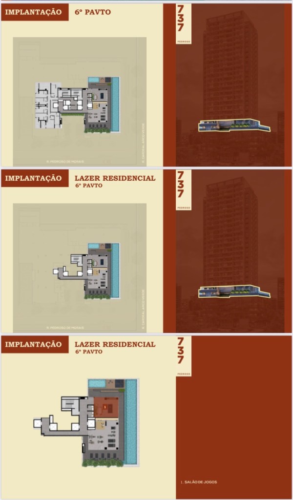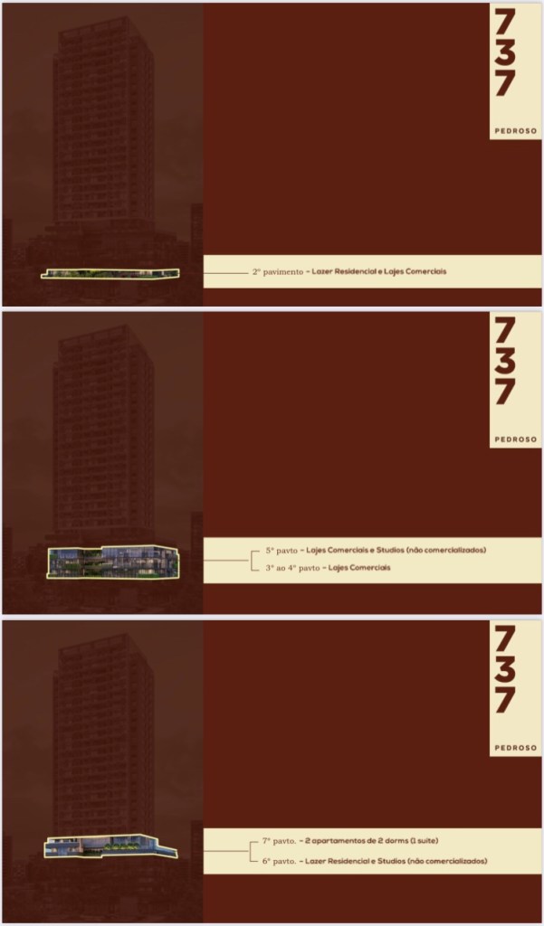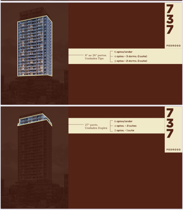 O Edifício estará na Rua Pedroso de Moraes 737 Pinheiros e serão 02 Dois Apartamentos Gardens de 99,99 Ms de 02 Dois Dormitórios e 01 Uma Suíte e 01 Uma Vaga de Garagem Determinada, 38 Apartamentos Tipo de 71,19 Ms de 02 Dois Dormitórios e 01 Uma Suíte e Uma Vaga de Garagem Determinada,76 Apartamentos de 85,65 Ms de 03 Três Dormitórios e 01 Uma Suíte e 01 Uma Vaga de Garagem Determinada,02 Duas Coberturas Duplex de 115,41 Ms de 01 Uma Suíte e 01 Uma Vaga de Garagem Determinada e 04 Quatro Coberturas Duplex de 138,92 Ms de 02 Duas Suítes e 01 Uma Vaga de Garagem Determinada e Lazer Completo !!!